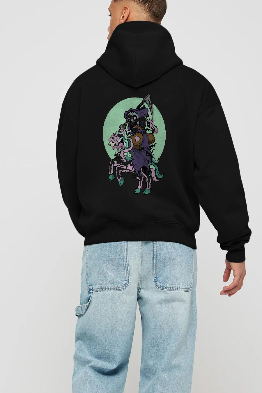 Grim Reaper Riding Unicorn Arka Baskılı Hoodie Oversize Kapüşonlu Sweatshirt Erkek Kadın Unisex