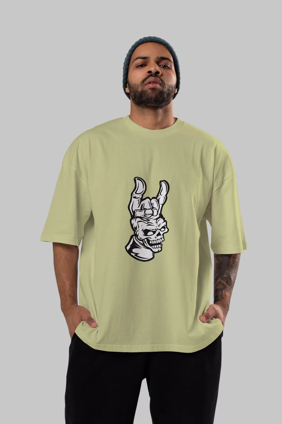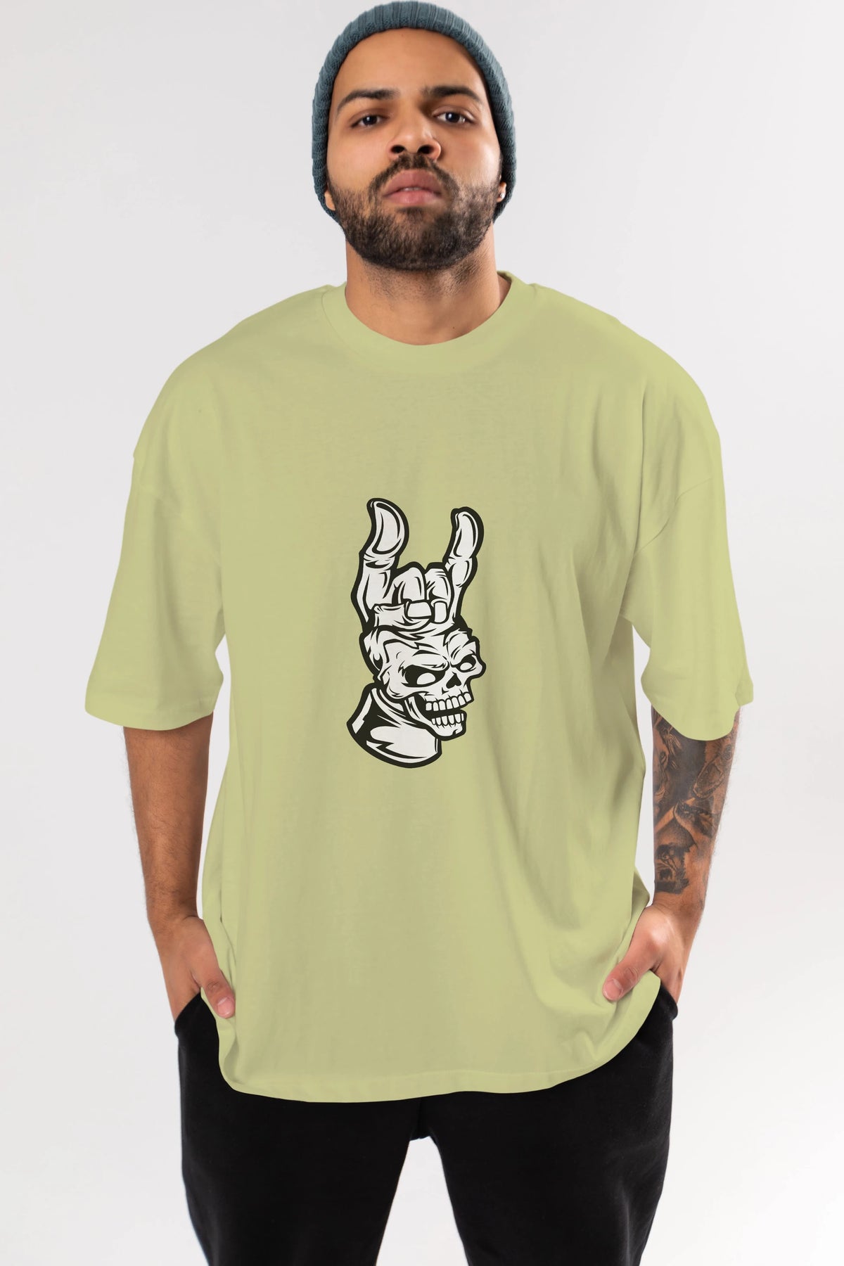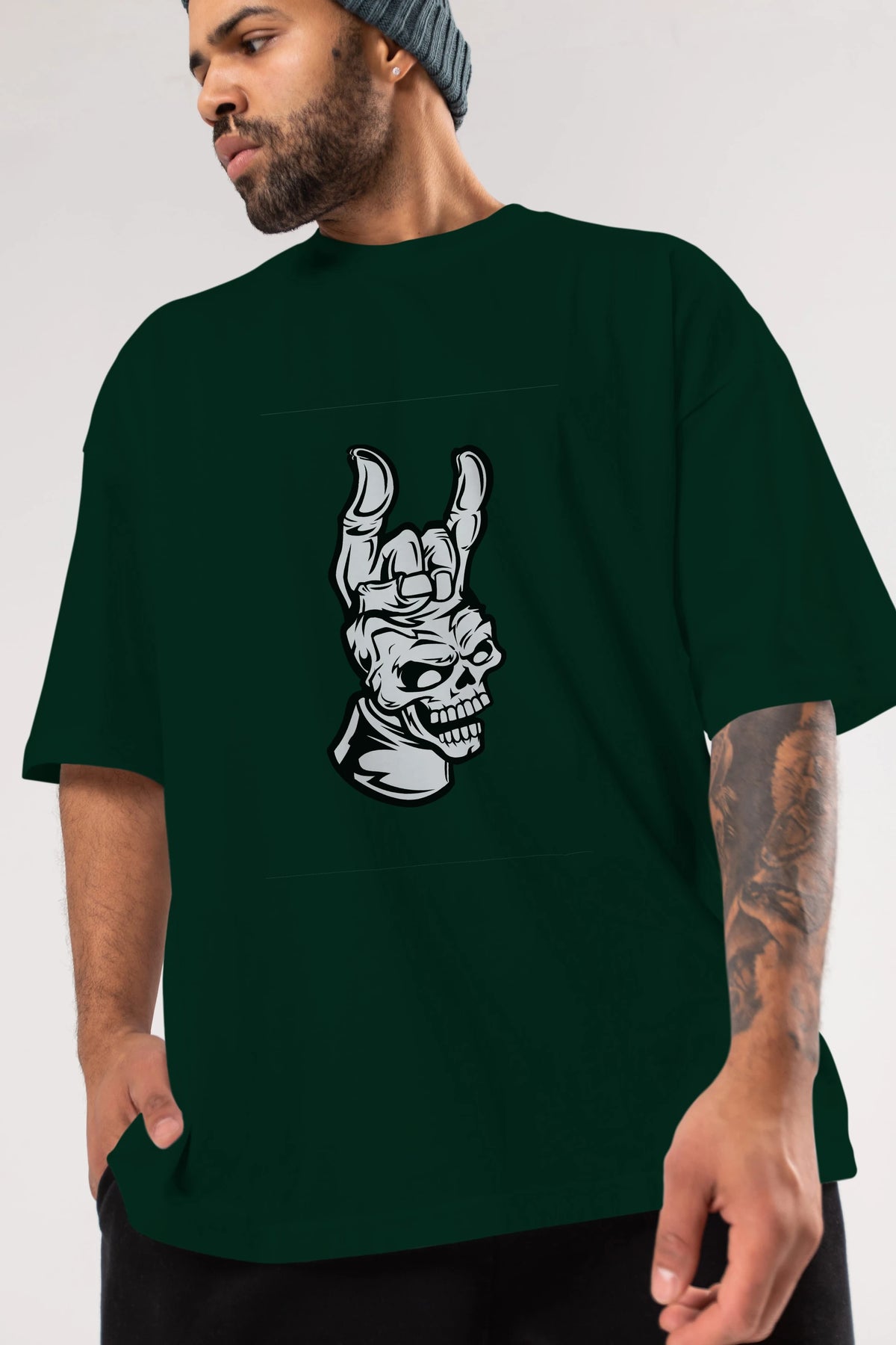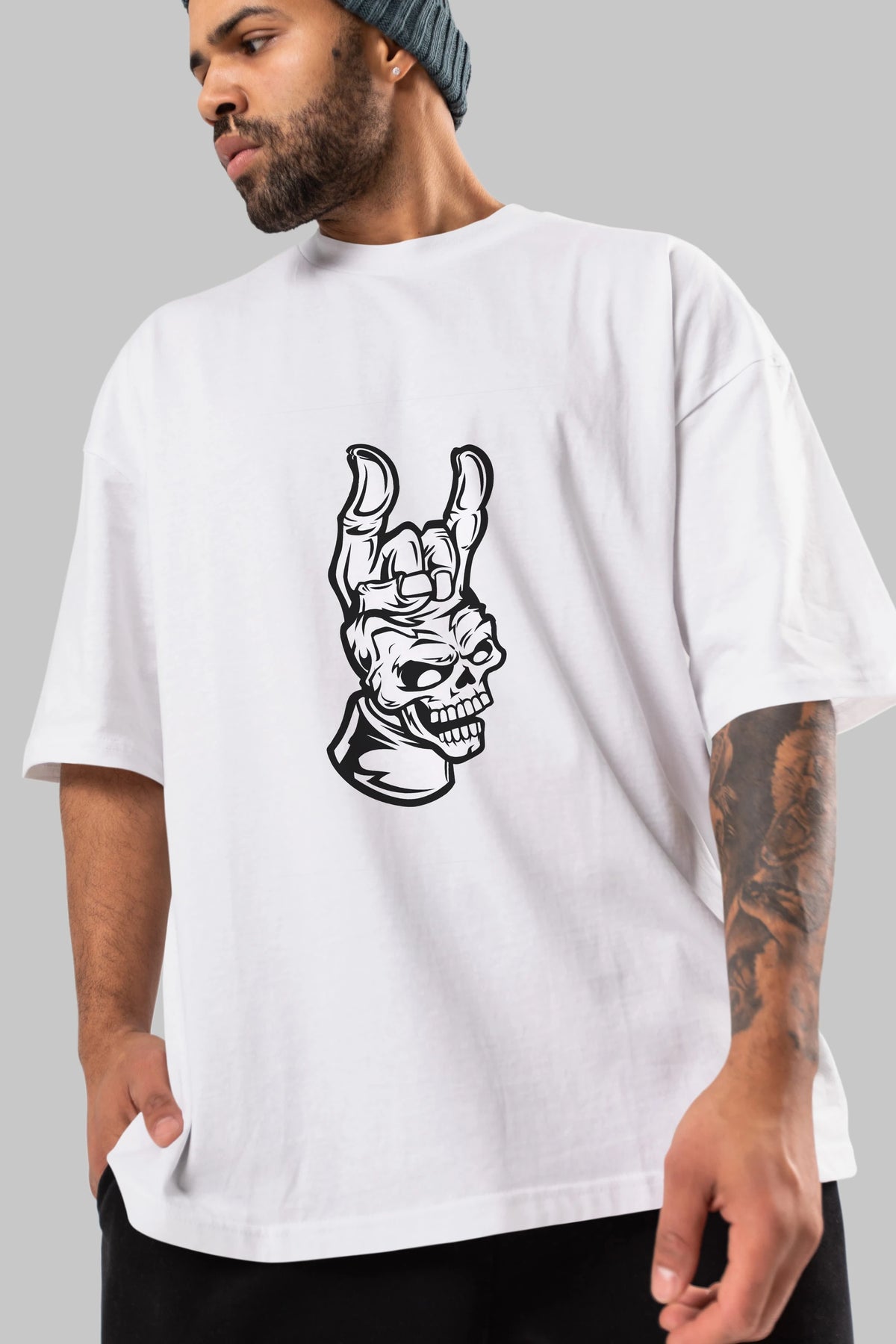 Hand Metal Skull Ön Baskılı Oversize t-shirt Erkek Kadın Unisex %100 Pamuk tişort