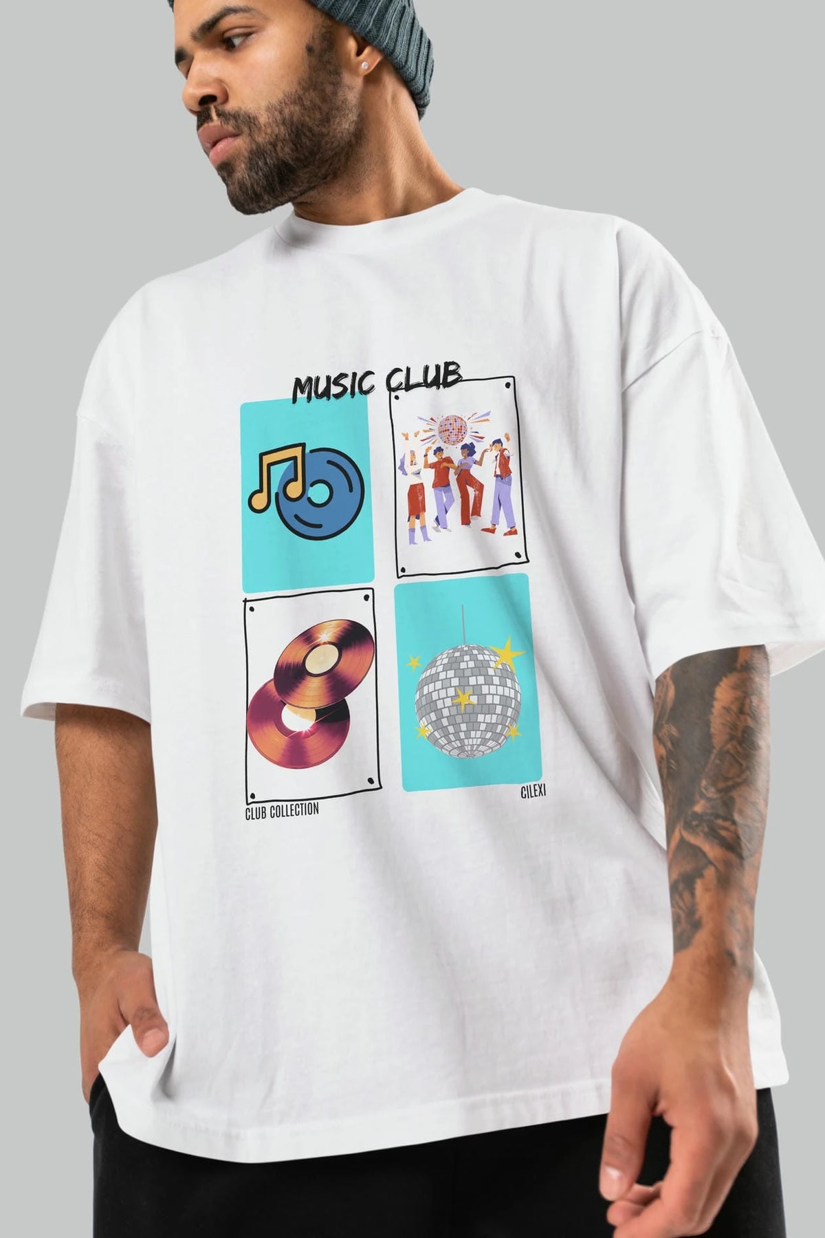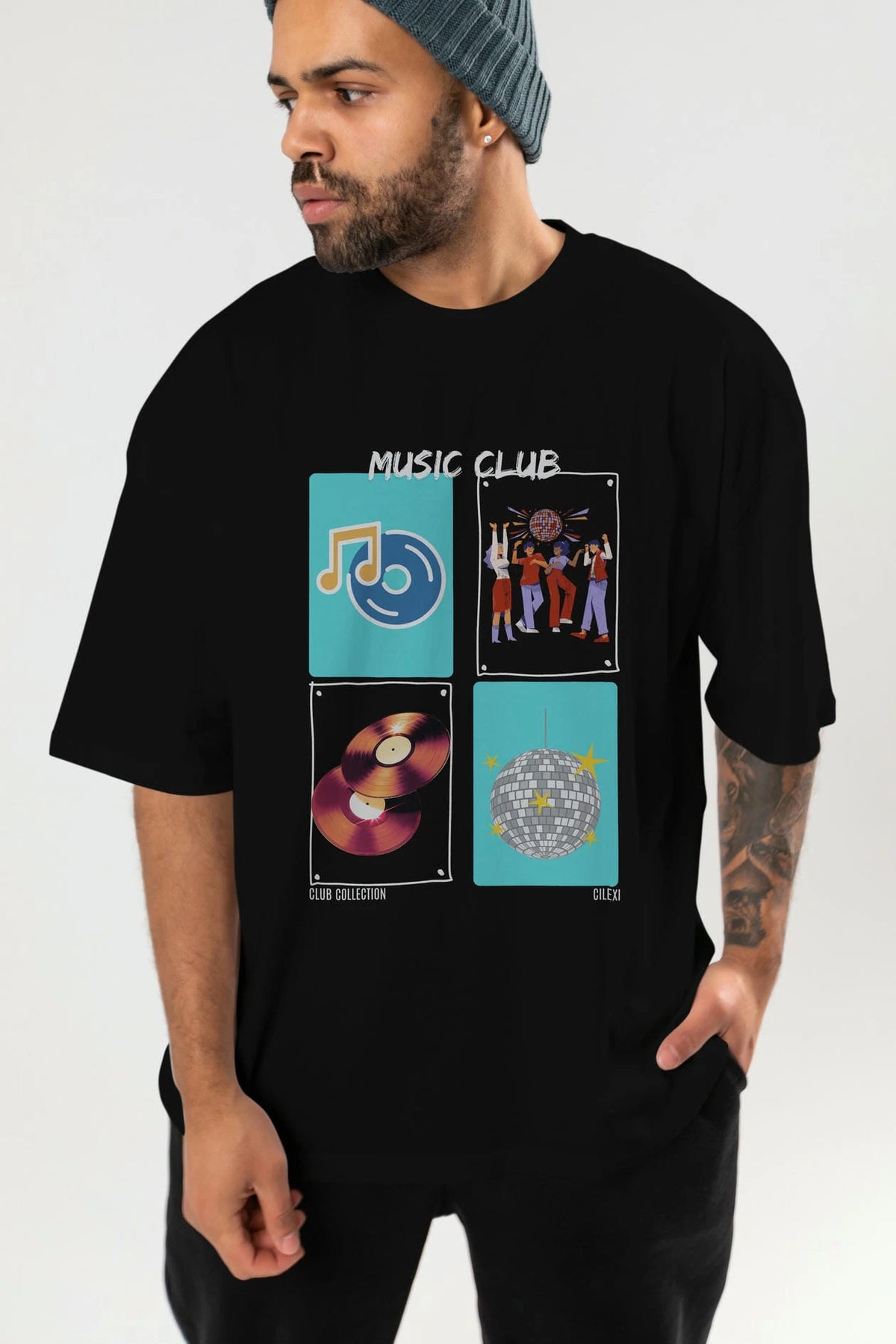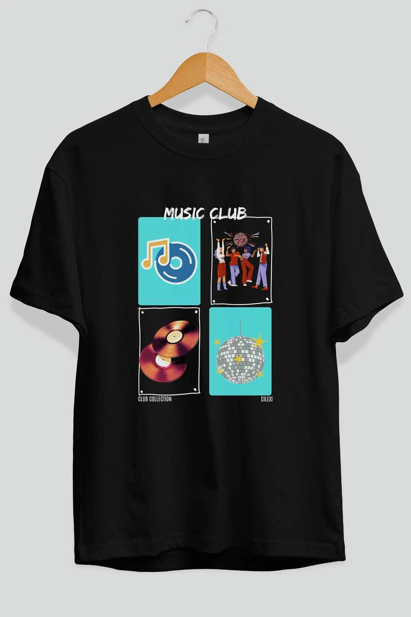 Music Club ön Baskılı Oversize t-shirt Erkek Kadın %100 Pamuk Bisiklet Yaka tişort