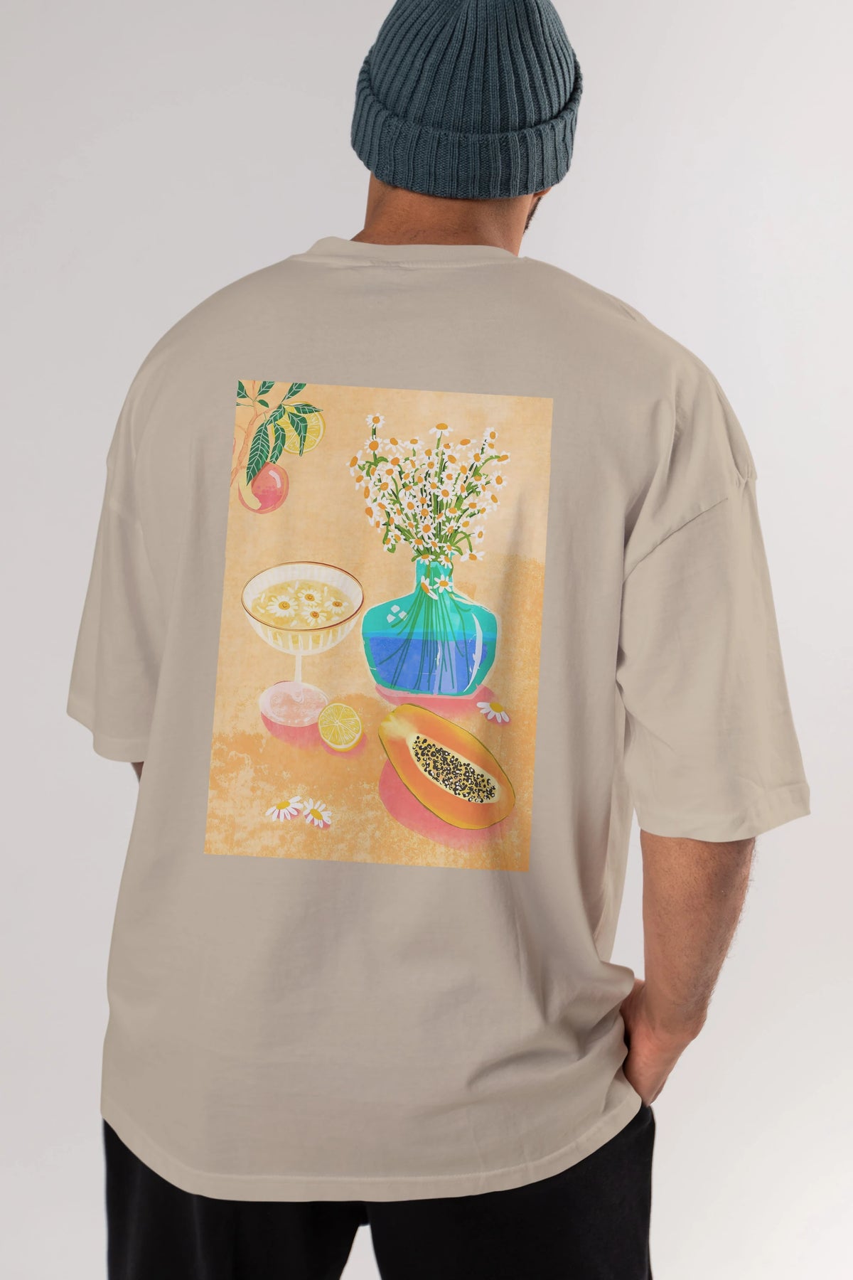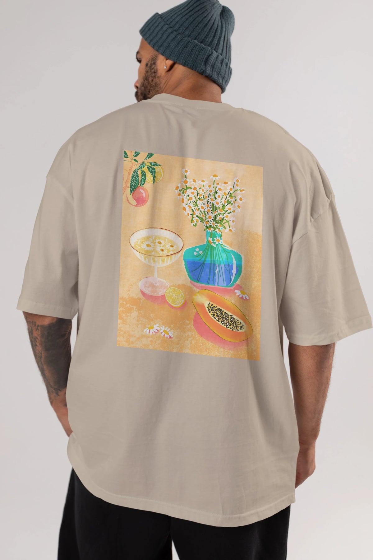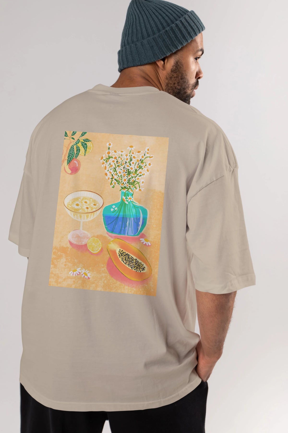 Hem erkekler hem de kadınlar için uygun, taze, modern bir baskıya sahip baskılı oversize t-shirt.