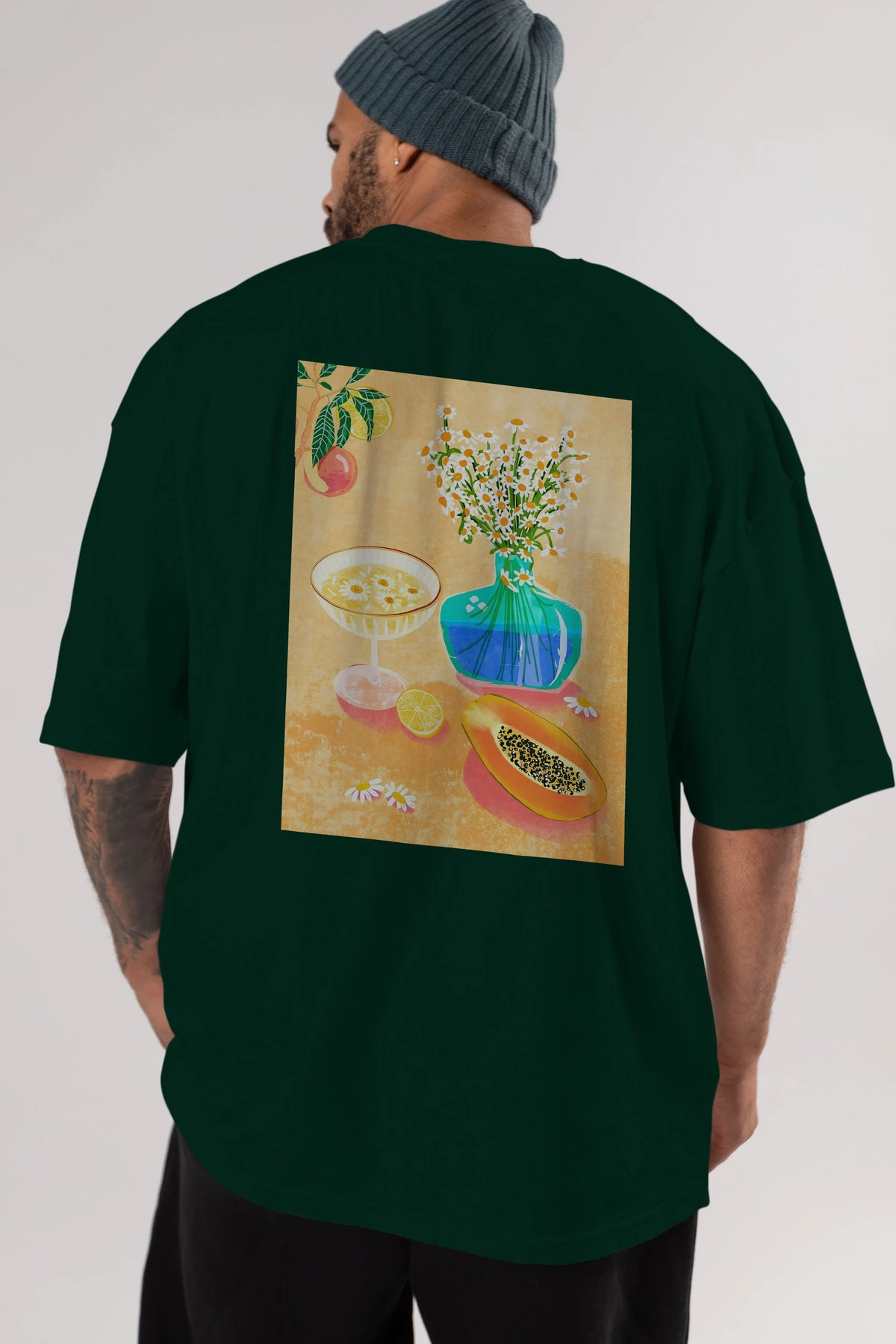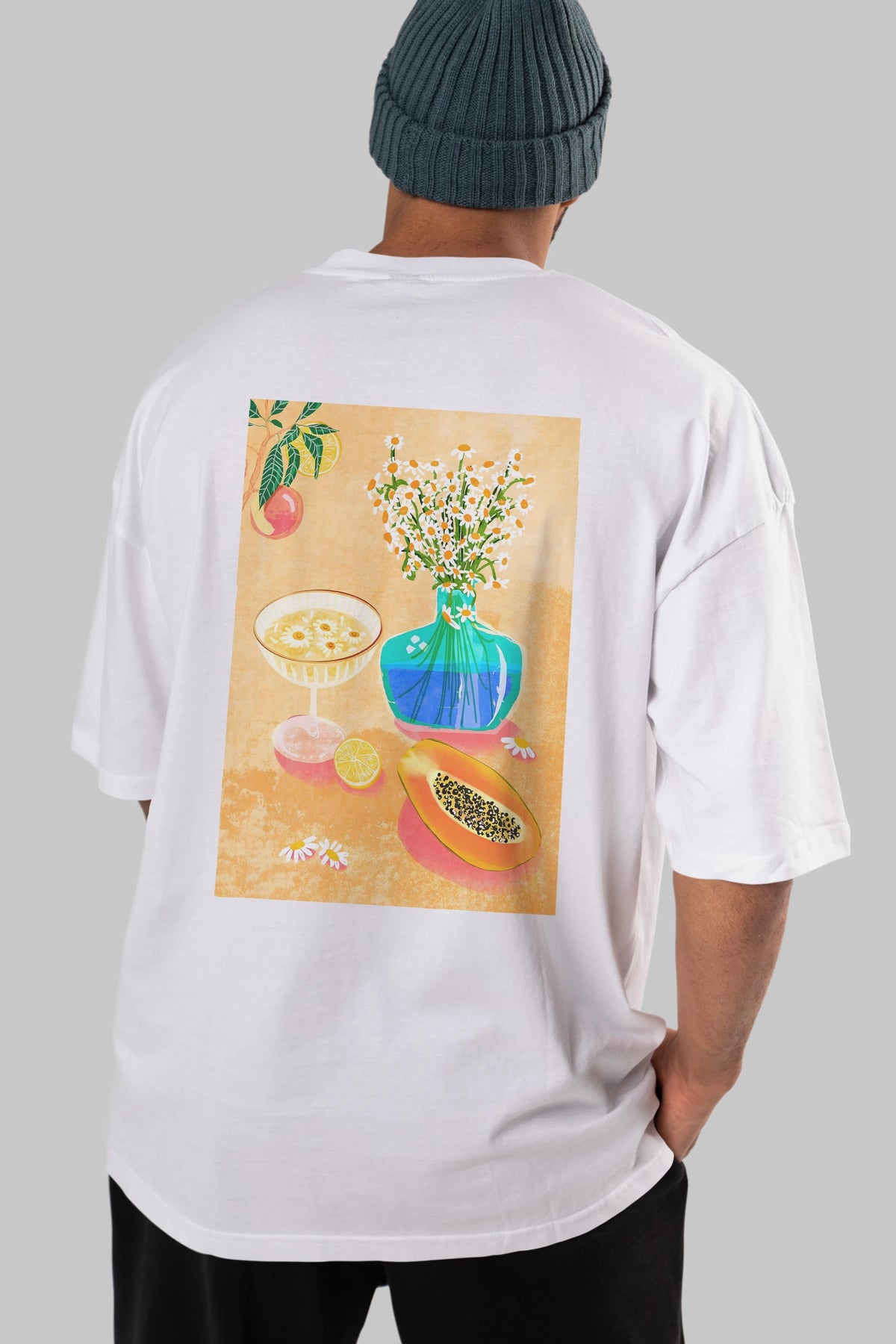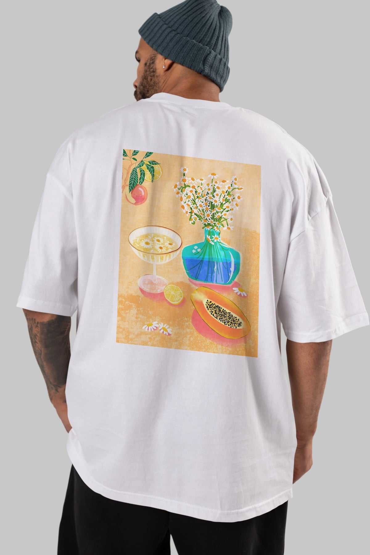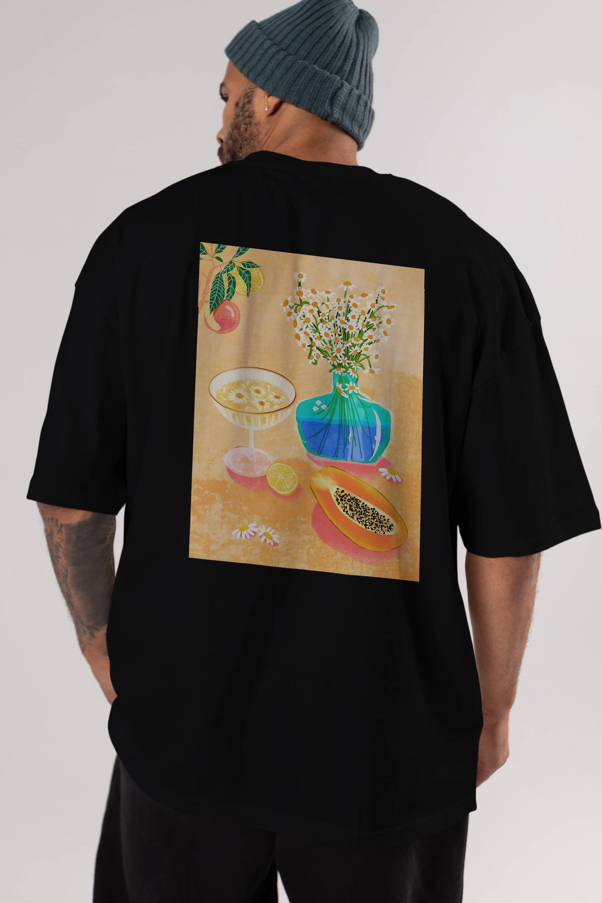 Hem erkekler hem de kadınlar için uygun, taze, modern bir baskıya sahip baskılı oversize t-shirt.