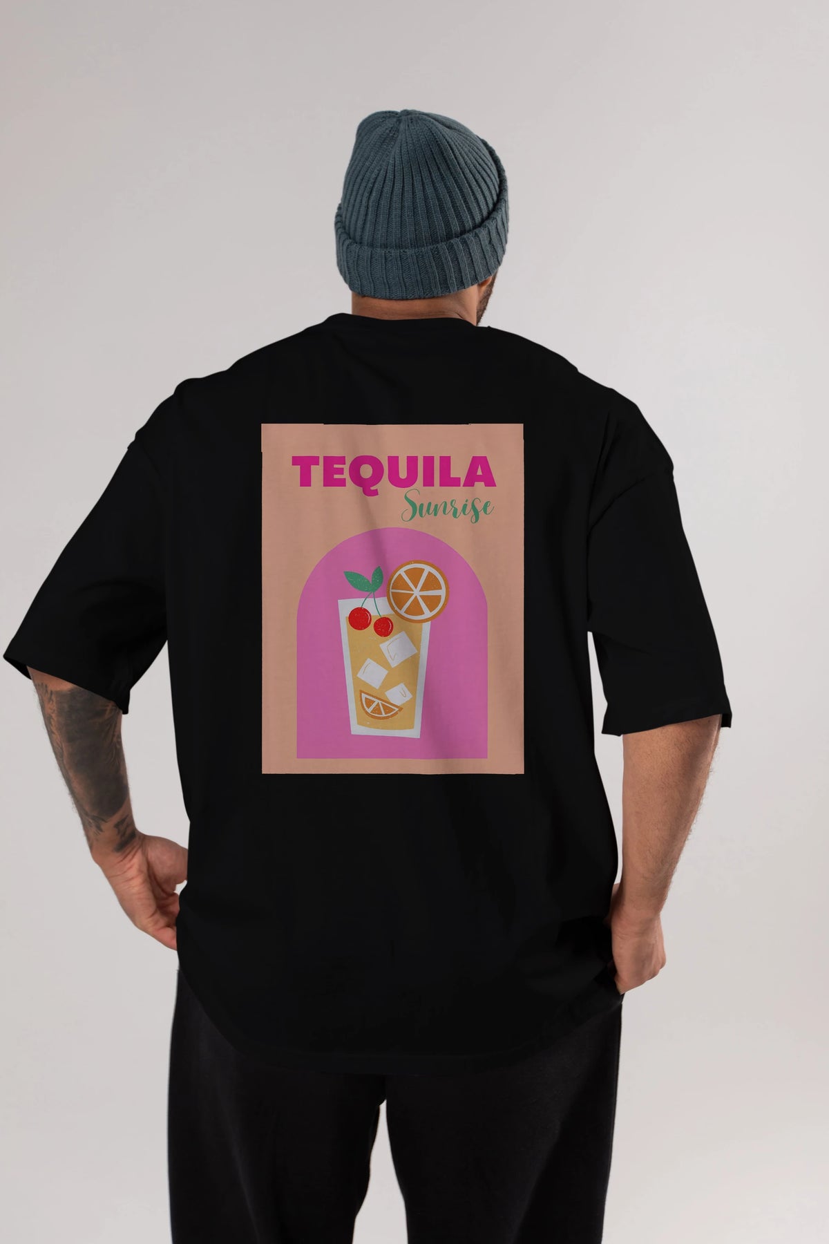 Tequila Sunrise 2 Arka Baskılı Oversize t-shirt Erkek Kadın Unisex %100 Pamuk Bisiklet Yaka tişort
