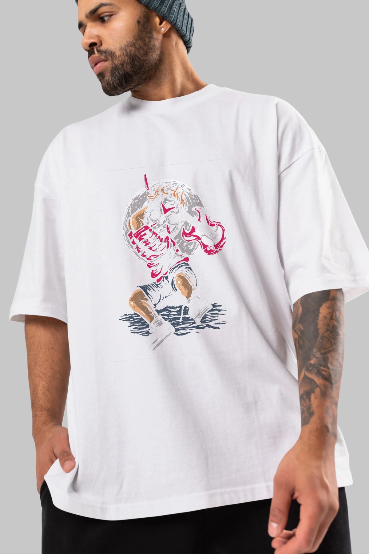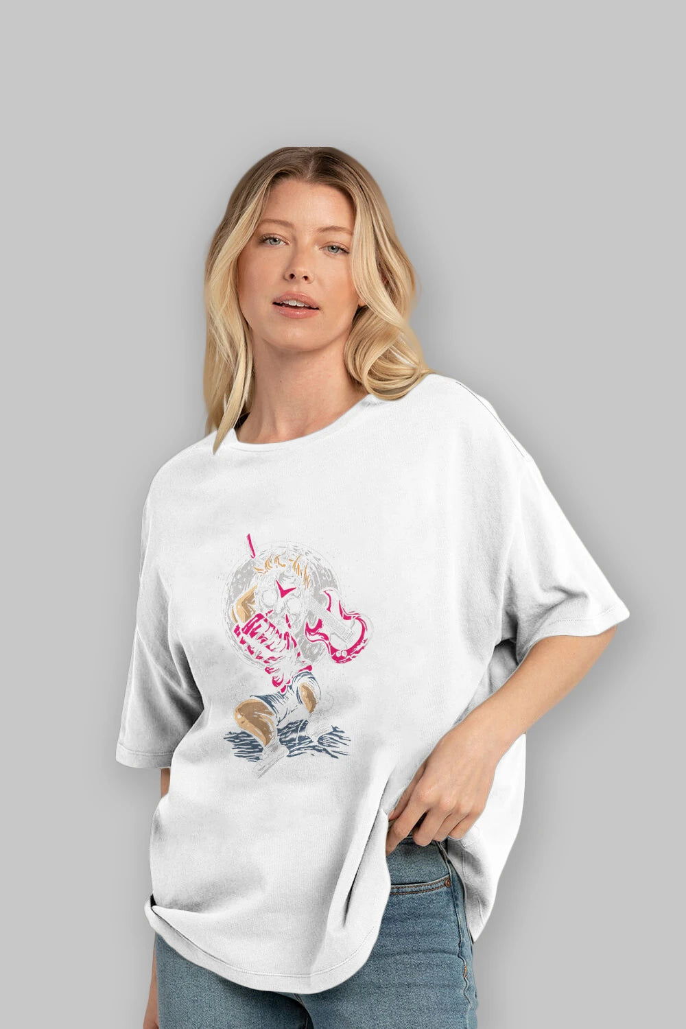 Hem erkekler hem de kadınlar için uygun, taze, modern bir baskıya sahip baskılı oversize t-shirt.