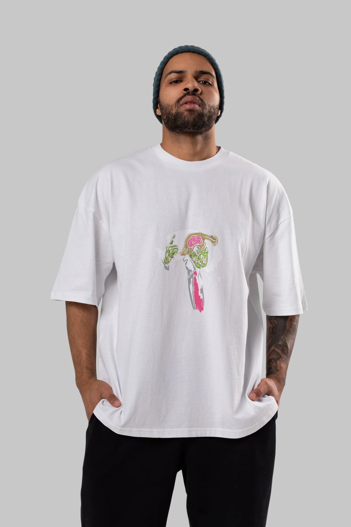 Hem erkekler hem de kadınlar için uygun, taze, modern bir baskıya sahip baskılı oversize t-shirt.