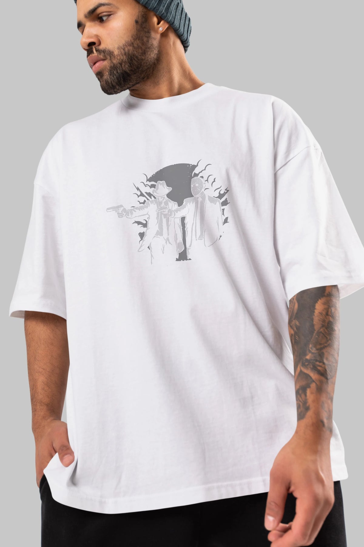 Hem erkekler hem de kadınlar için uygun, taze, modern bir baskıya sahip baskılı oversize t-shirt.