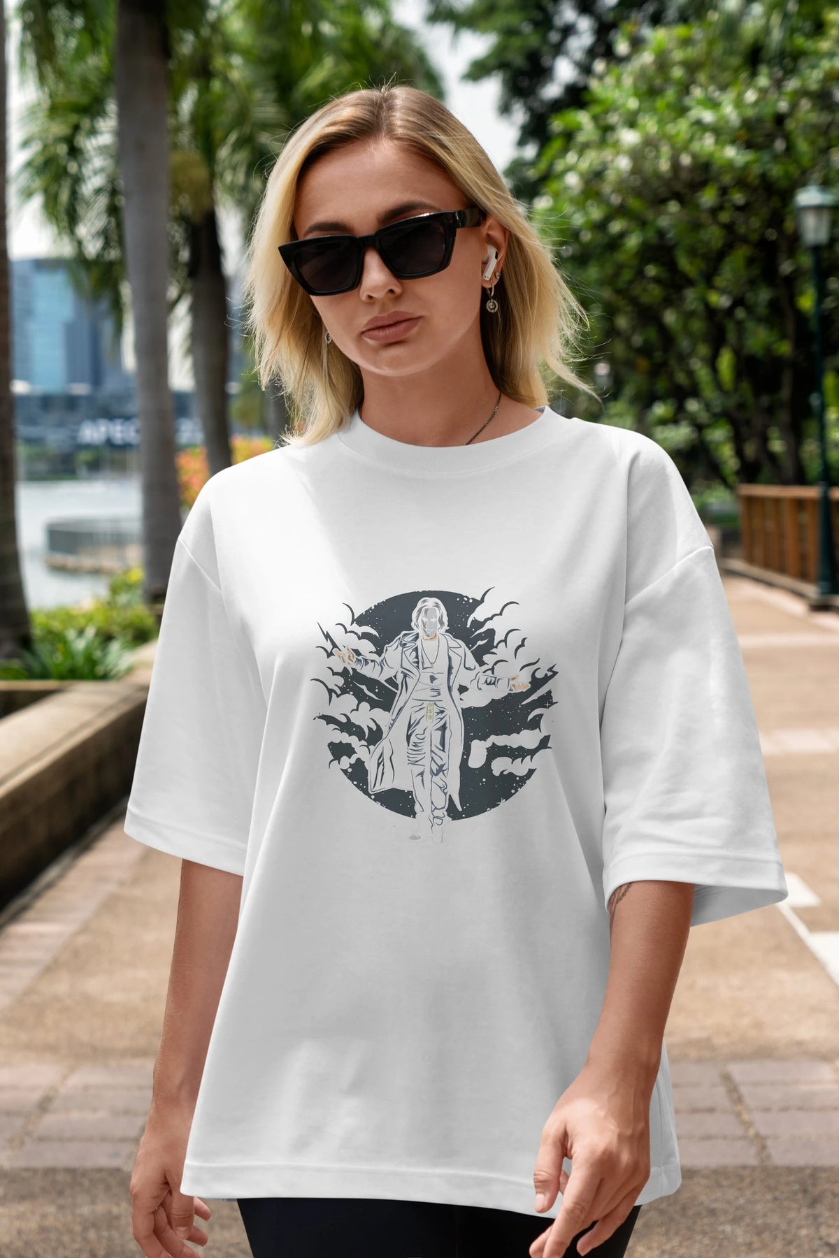 Hem erkekler hem de kadınlar için uygun, taze, modern bir baskıya sahip baskılı oversize t-shirt.