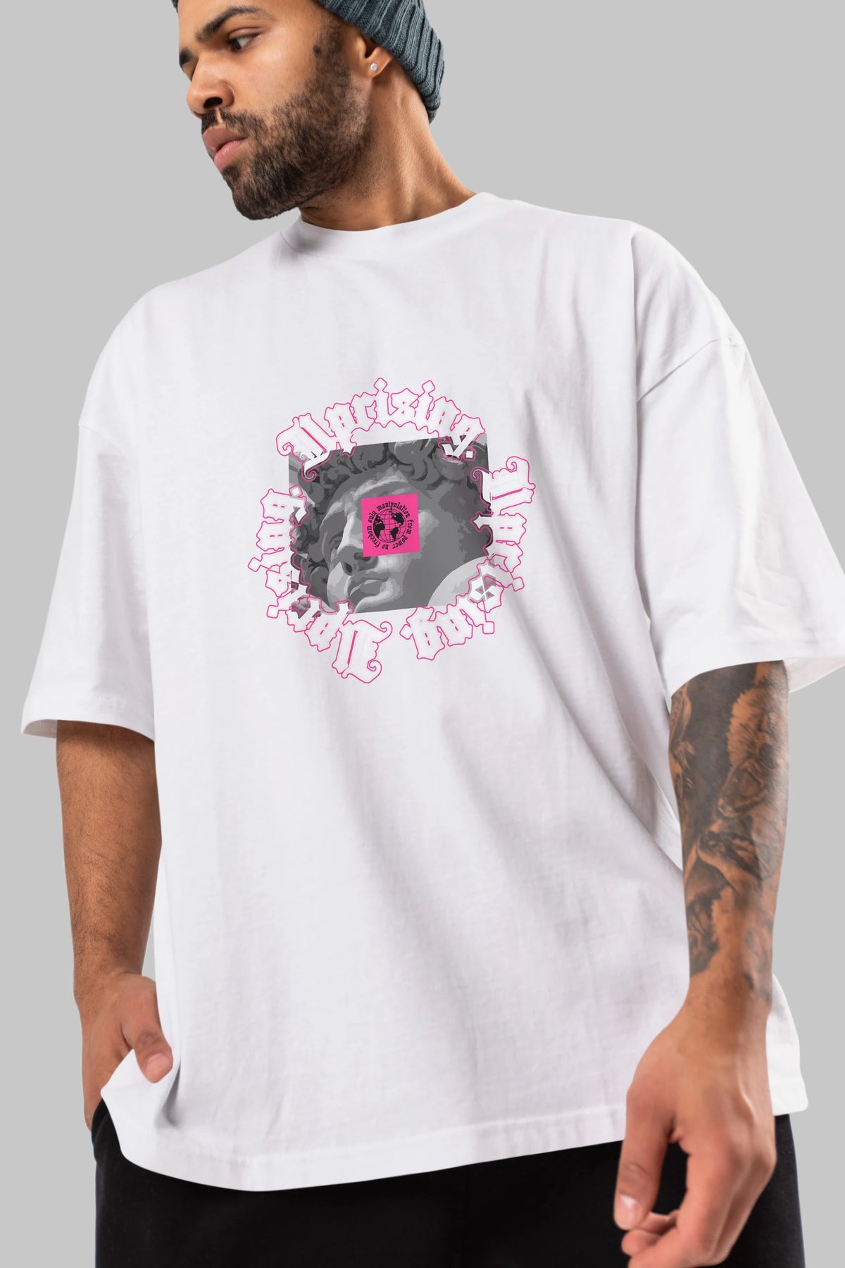 Hem erkekler hem de kadınlar için uygun, taze, modern bir baskıya sahip baskılı oversize t-shirt.
